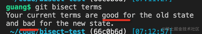 这时候 git bisect terms 可以看到确实标记变了: