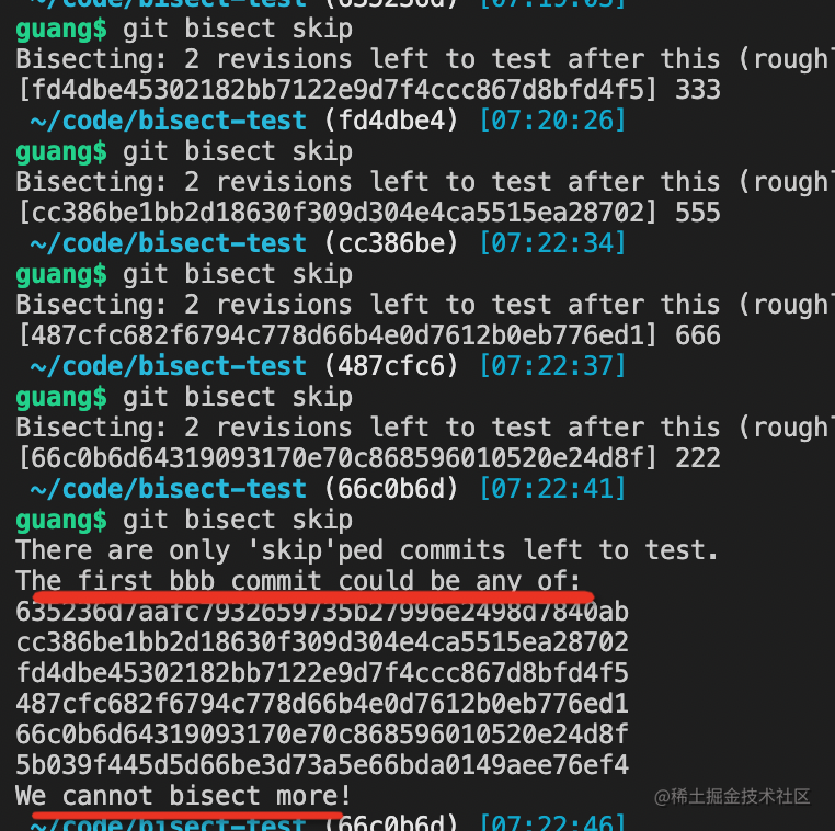 那 bisect 也没办法,它会把所有剩下的 commit 列出来,告诉你这些还没测试: