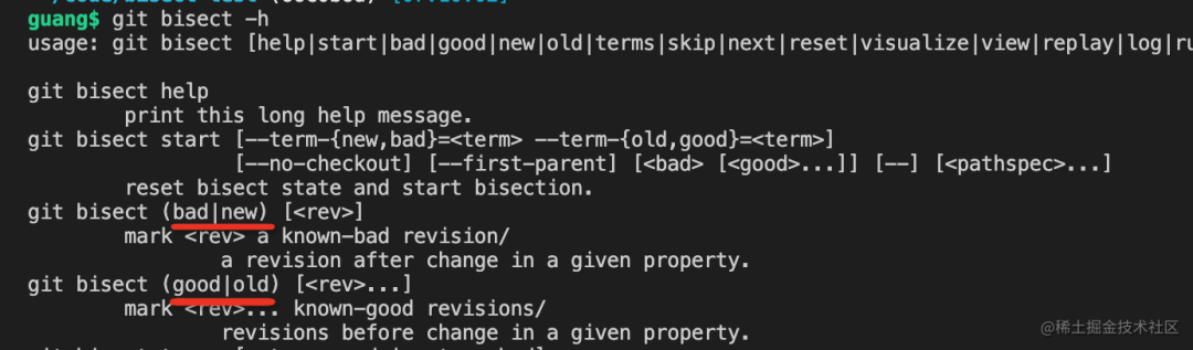 git bisect good/new:指定某个 commit 为 good/new
