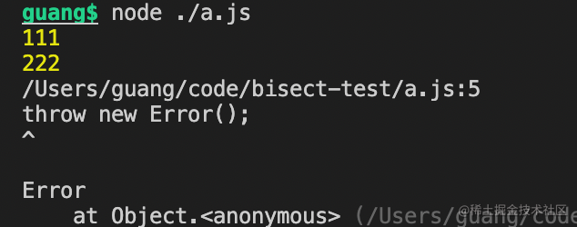 #!/usr/bin/env nodeconst { execSync } = require('child_process');const fs = require('fs');if(!fs.existsSync('./a.js')) { process.exit(125);}try { execSync(' node ./a.js'); process.exit(0);} catch(e) { process.exit(1);}返回 0 代表当前 commit 是 good,返回 1 到 125 之间的数字代表是 bad,而返回 125 代表 skip。