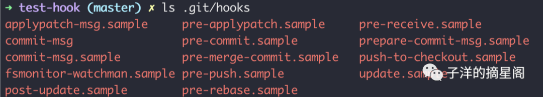 通常情况下,在当前项目的 <project root>/.git 目录下会有一个 hooks 目录,里面会有官方提供的各个 hook 的示例,如果没有的话也不用担心,新建一个 hooks 目录即可。