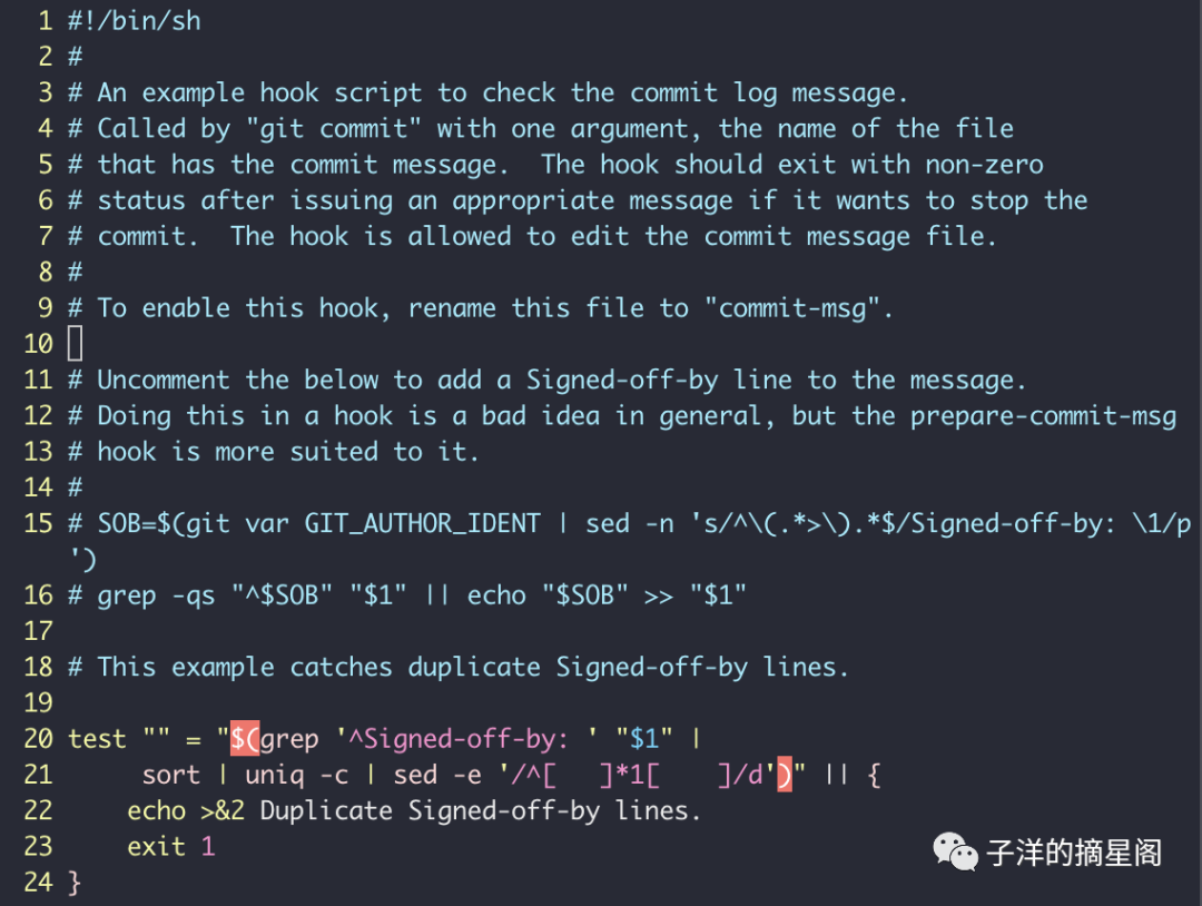 示例代码会有一个 .sample 后缀,去掉后缀后,hook 文件就生效了,提供的示例大部分都是 shell 编写的,我们在这里看一下示例中的 commit-msg