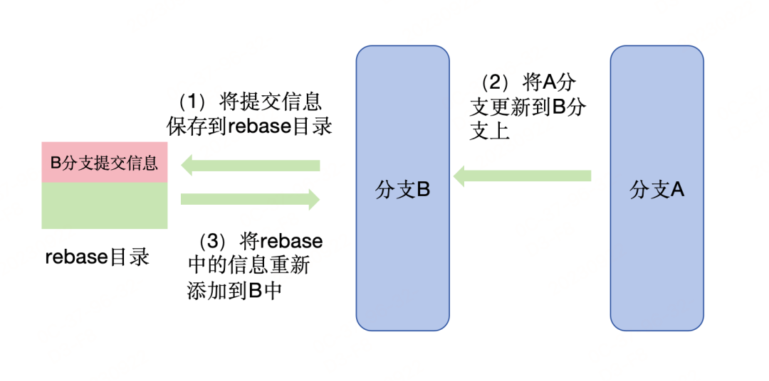 该命令也可以用于合并分支,但是与 git merge 有一定的区别。假如我们想把 A 分支上的代码合并到 B 分支上,可以运行如下命令: