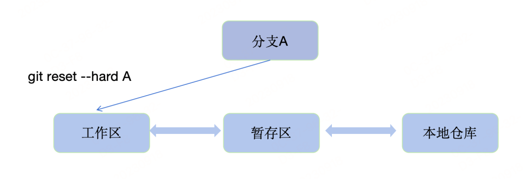 (1)git reset命令是用来完成重置操作的,可以重置本地仓库、暂存区和工作区 3 个区域的内容,你可以根据需要灵活选择。常见的用法是git reset HEAD^,用于回到上一个版本,也可以指定为某个具体的版本。该命令有 3 个参数。针对每个命令的不同作用,我将以可视化的方式进行展示,绿色模块表示该区域存放的是当前修改内容,紫色模块表示该区域已经被重置为分支 A 的内容。