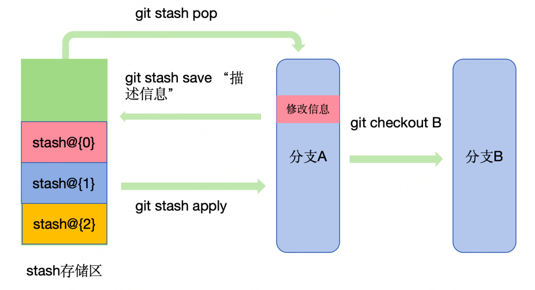使用该命令,可以把未提交的更改保存到一个 stash 区域,存储区类似于一个栈结构,最新的保存信息会处于顶端,其索引为stash@{0},最早的保存信息位于栈的最底端。图 7 中分支 A 中的 “修改信息”,也就是粉色区域,会被加入到 stash 存储区中。