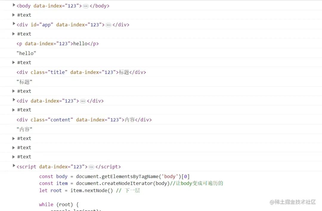 <body> <div id="app"> <p>hello</p> <div class="title">标题</div> <div> <div class="content">内容</div> </div> </div> <script> const body = document.getElementsByTagName('body')[0] const item = document.createNodeIterator(body)//让body变成可遍历的 let root = item.nextNode() // 下一层 while (root) { console.log(root); if (root.nodeType !== 3) { root.setAttribute('data-index', 123)//给每个节点添加一个属性 } root = item.nextNode() } </script></body>上面代码成功遍历到了各个 DOM 结构: