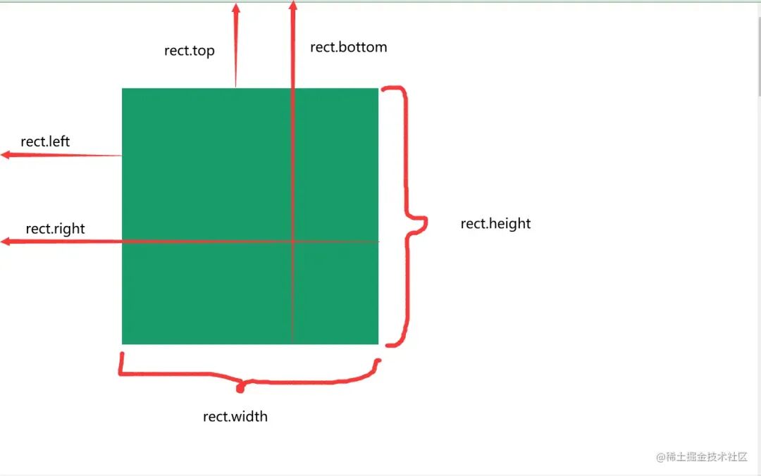 x:元素左边界相对于视口的 x 坐标。y:元素上边界相对于视口的 y 坐标。width:元素的宽度。height:元素的高度。top:元素上边界相对于视口顶部的距离。right:元素右边界相对于视口左侧的距离。bottom:元素下边界相对于视口顶部的距离。left:元素左边界相对于视口左侧的距离。