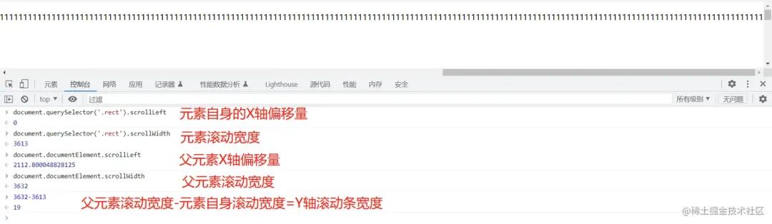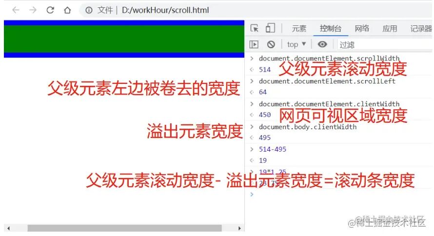 溢出元素的宽度(document.body.scrollWidth)=父级元素的宽度(document.documentElement.scrollWidth) - 滚动条的宽度(在谷歌浏览器上滚动条的宽度是19px)image.png