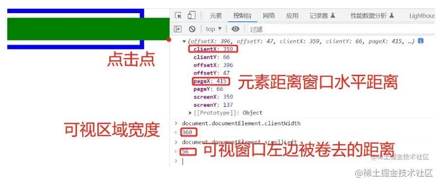 我们点击下图绿色块的右下角,把 pageX 和 clientX 值打印出来。如下图所示: