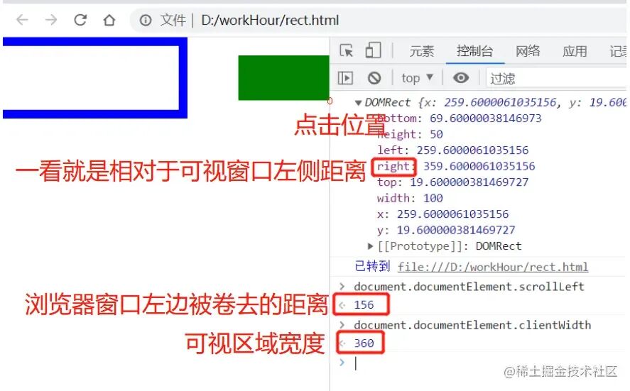 从下图可以看出,当有滚动条出现的时候,right 的值是 359.6,而不是 360+156(x 轴的偏移量), 说明通过 getBoundingClientRect 获取的属性值是不计算滚动偏移量的,是相对浏览器可视区域而言的。
