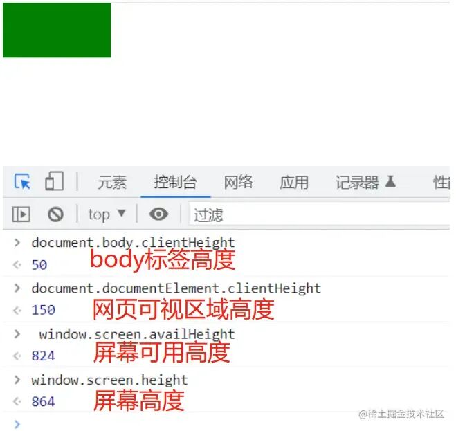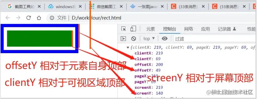 <!DOCTYPE html><html lang="en"><head> <meta charset="UTF-8"> <meta http-equiv="X-UA-Compatible" content="IE=edge"> <!-- <meta > --> <title>JS Dom各种距离</title> <style> html, body { margin: 0; } body { width: 200px; padding: 10px; border: 10px solid blue; } .rect { height: 50px; background-color: green; } </style></head><body> <div id="rect" class="rect"></div></body><script> const rectDom = document.querySelector('#rect'); rectDom.addEventListener('mousedown', ({ offsetX, offsetY, clientX, clientY, pageX, pageY, screenX, screenY }) => { console.log({ offsetX, offsetY, clientX, clientY, pageX, pageY, screenX, screenY }); })</script></html>我们通过 y 轴方向的高度值, 了解一下这几个属性的含义。 绿色块的高度是 50px, 我们找个特殊的位置(绿色块的右小角)点击一下,如下图所示: