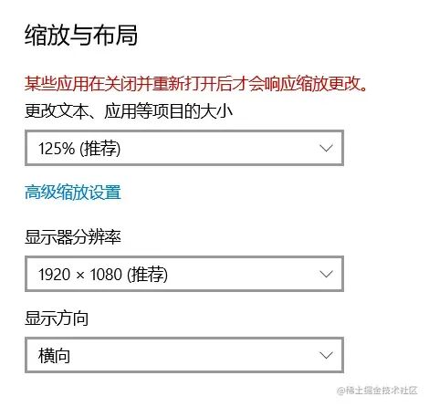 发现是由笔记本电脑屏幕的缩放设置决定的,如果设置成 100%, 此时 window.screen.width 与笔记本电脑的显示器分辨率 X 轴方向的数值一致, 都是 1920(如右侧图所示), 此时屏幕上的字会变得比较小, 比较伤视力。
