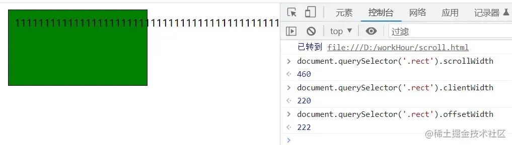 <!DOCTYPE html><html lang="en"><head> <meta charset="UTF-8"> <meta http-equiv="X-UA-Compatible" content="IE=edge"> <!-- <meta > --> <title>JS Dom各种距离</title> <style> div { border: 1px solid #000; width: 200px; height: 600px; padding: 10px; background-color: green; margin: 10px; } </style></head><body> <div class="rect"> 111111111111111111111111111111111111111111111111111111111111111111111111111111111111111111111111111111111111111111111111111111111111111111111111111111111111111111111111111111111111111111111111111111111111111111111111111111111111111111111111111111111111111111111111111111111111111111111111111111111111111111111111111111111111111111111111111111111111111111111111111111111111111111111111 </div></body><script></script></html>offsetWidth 和 clientWidth 的关系?