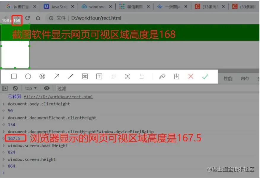 如下图所示,截图时在未把网页可视区域的滚动条高度计算在内的条件下, 截图工具显示的网页可视区域高度是 168, 浏览器显示的网页可视区域的高度是 167.5, 误差 0.5,由于截图工具是手动截图,肯定有误差,结果表明,网页可视区域的高度 不包括滚动条高度。宽度同理。