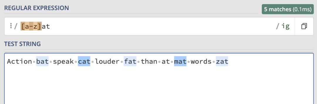 如果我们想要在字符串中匹配所有以 at 结尾的单词,最直接的方式是使用字符集,并在其中提供所有的字母。对于这种在一个范围中的字符, 就可以直接定义字符范围,用-表示。它用来匹配指定范围内的任意字符。这里就可以使用/[a-z]at/ig: