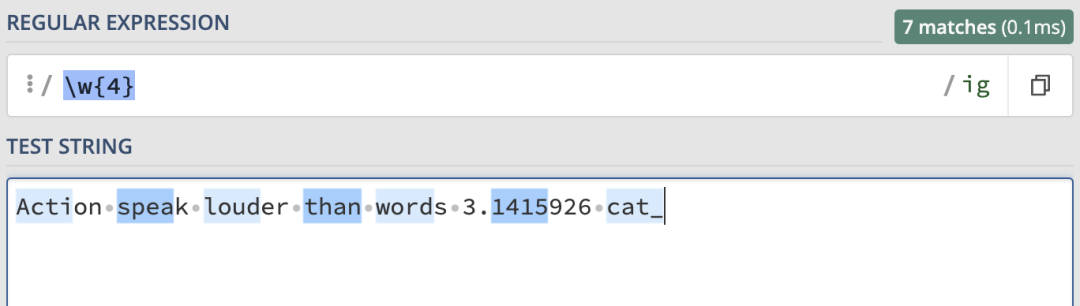 \d来匹配任意数字、字母和下划线。这里就匹配到了 7 个连续四位的字符。