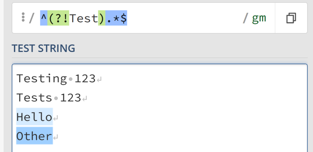 /B(?!A)/我们甚至可以将负向前瞻组合使用,并使用 ^ 和 $ 这些元字符来尝试匹配完整的字符串。例如,以下的正则表达式将匹配任何不以 "Test" 开头的字符串: