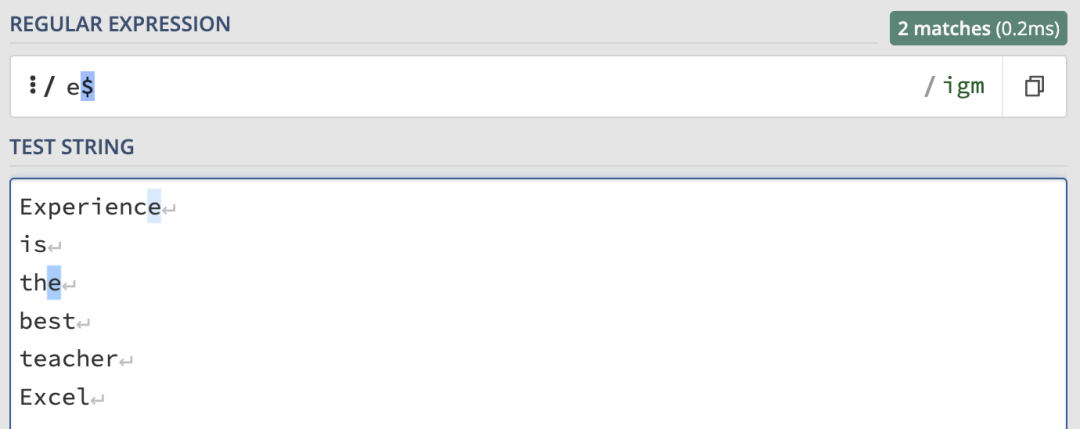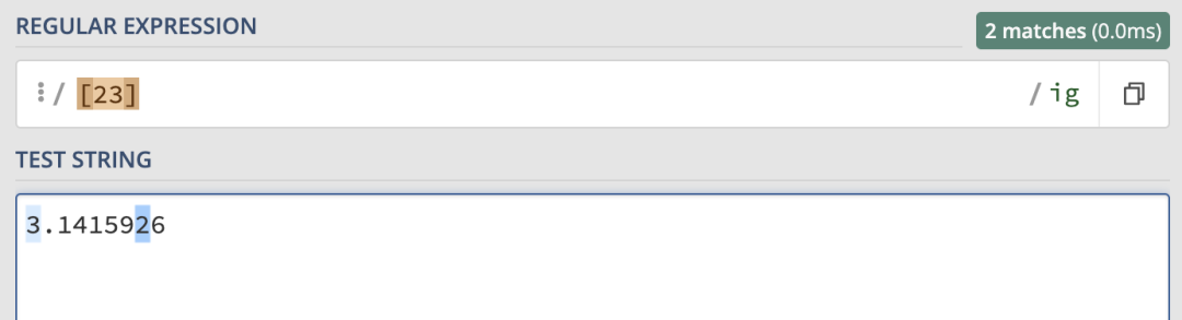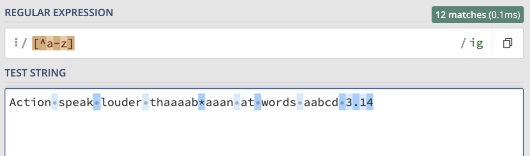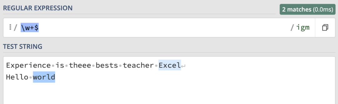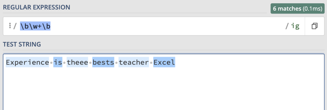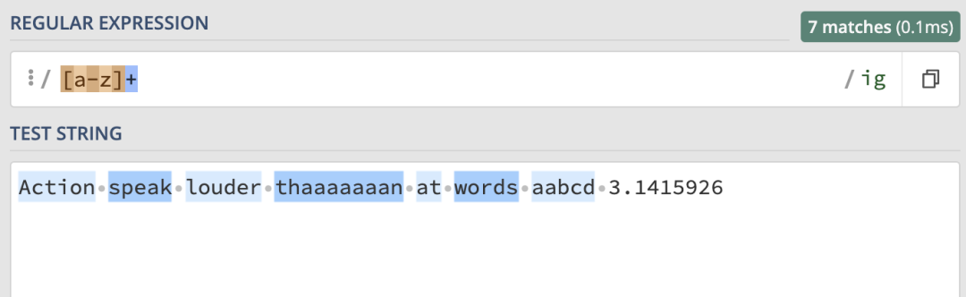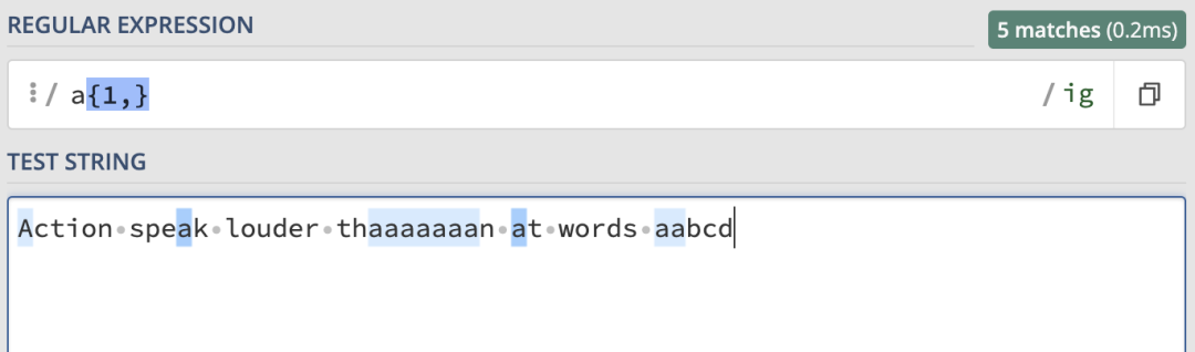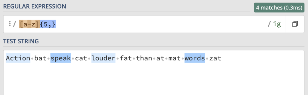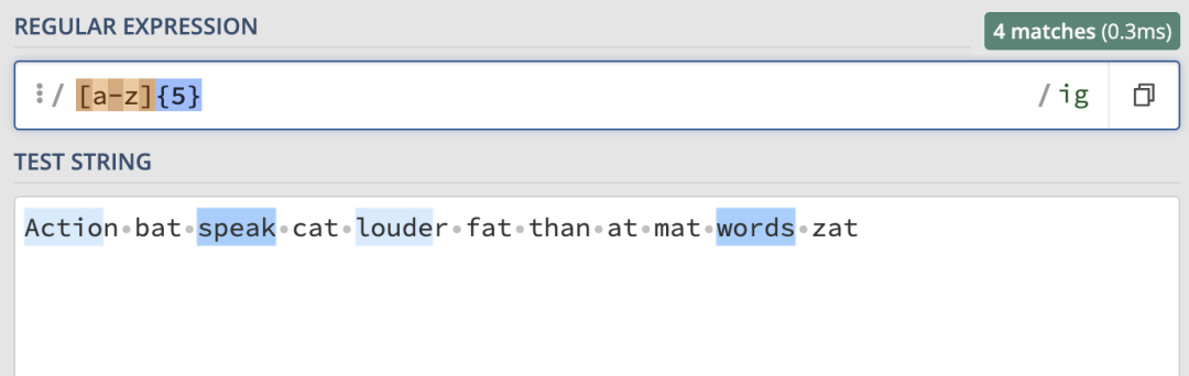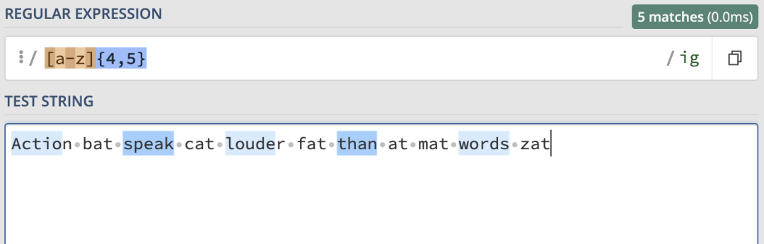 可以看到,这里我们匹配到了所有连续 5 个字母的单词(包括超过 5 个字母的单词,不过只会匹配到前 5 个字母)。