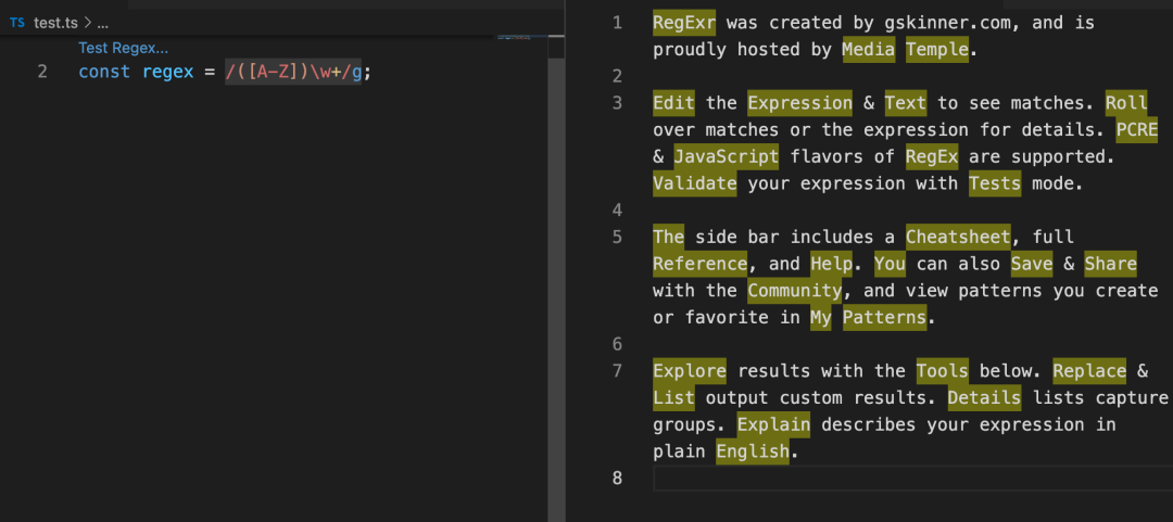 Regex previewer 是一个 VScode 插件,在插件市场搜索名称即可安装。当我们在编写正则表达式时,可以直接使用快捷键 Ctrl+Alt+M (windows)或者 ⌥+⌘+M(Mac)在编辑器右侧启动一个标签页,我们可以在这个标签页写一写测试用例,用来测试我们写的正则表达式,写完字符串用例之后,点击我们编写的正则表达式上方的 Test Regex... 即可,这样右侧匹配到字符就会高亮显示了,如下图: