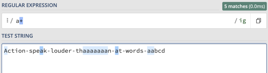 来看一个简单的例子,这里我们匹配的正则表达式为/a+/ig,结果如下: