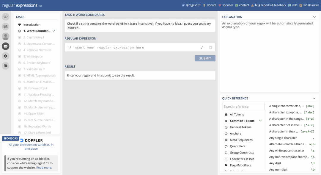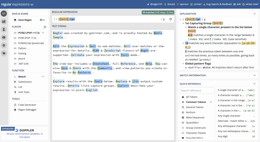 Regex101 是学习正则表达式最有效的工具网站之一,本文的示例使用的就是这个工具。在 REGULAR EXPRESSION 栏中可以输入正则表达式,可以在输入框右侧选择需要的修饰符,在下面的 TEST STRING 栏中输入要测试的字符串,即可显示出匹配到的结果。在右侧的 EXPLANATION 区域会显示出对输入的正则表达式的详细解释。右下角的 QUICK REFERENCE 栏会显示正则表达式速查表。