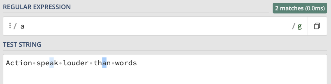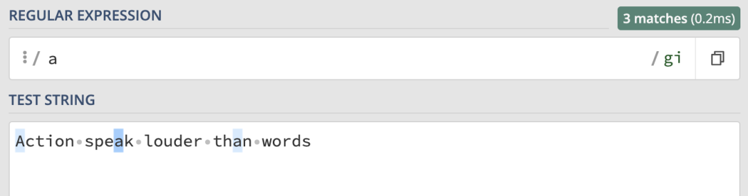 /a/gi这时所有的 a 都被匹配到了,无论是大写还是小写,总共匹配到了三个 a: