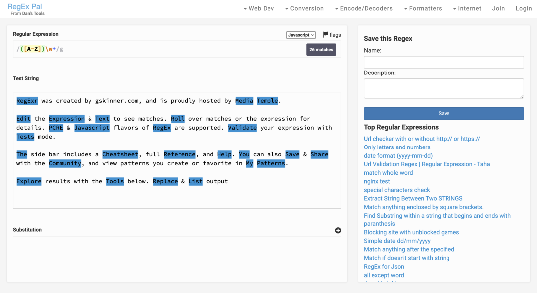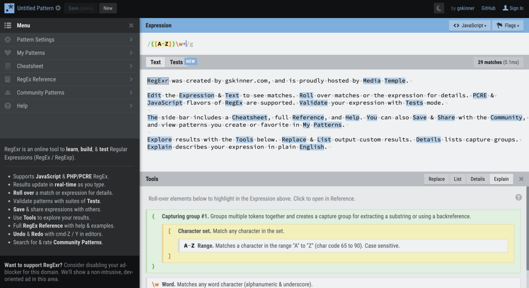 RegExr 是一个基于 JavaScript 开发的在线工具,用来创建、测试和学习正则表达式。它是一个开源的工具,具有以下特性: