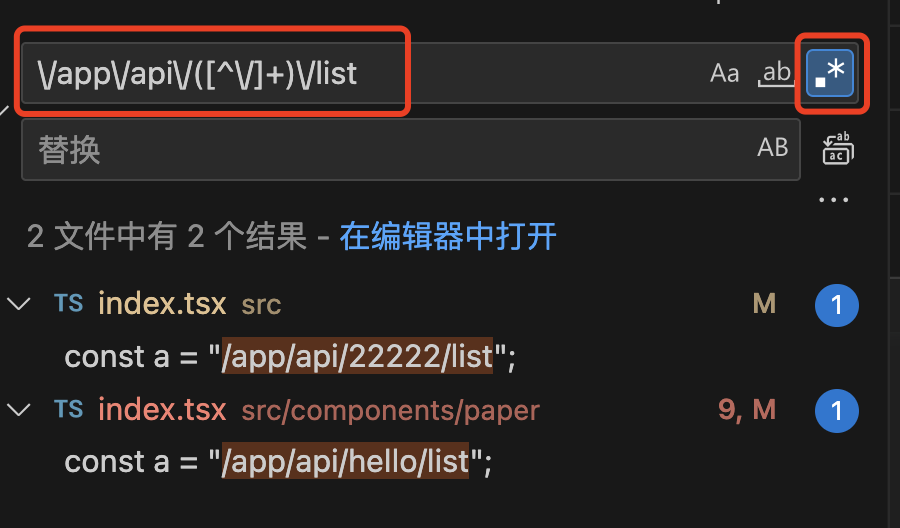 另一个例子就是在 IDE 中进行正则表达式搜索和替换操作。比如,在 VS Code 中,只需在搜索栏中点击搜索栏左侧的正则表达式按钮(.*)或按下快捷键 Alt + R,就可以激活正则表达式搜索模式。
