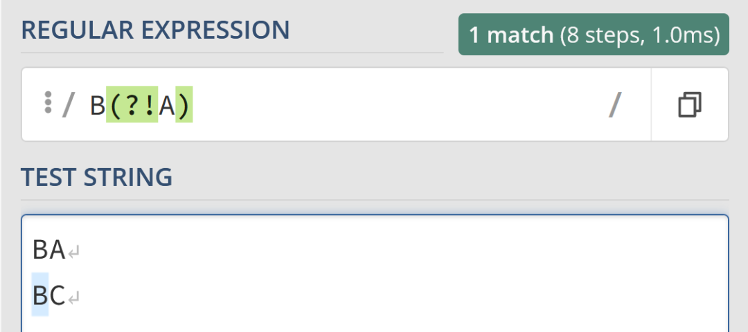例如,使用负向前瞻可以匹配 BC,但不会匹配 BA。