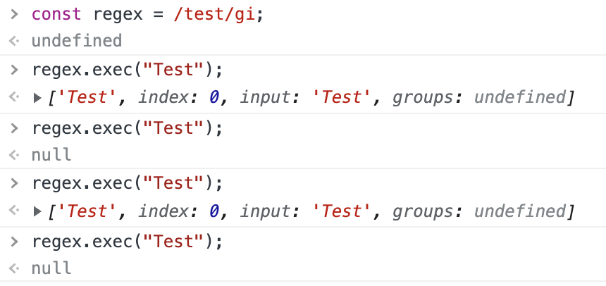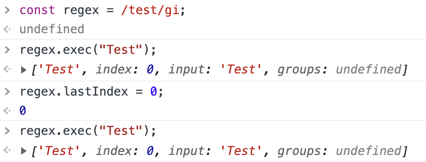 为了解决这个问题,我们可以在运行每个 exec 命令之前将lastIndex赋值为 0: