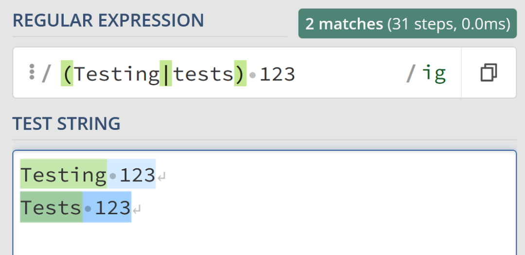 Hello 和 Other,但无法匹配 Testing 123 和 Tests 123。