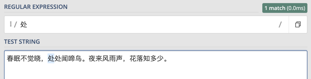 /正则表达式主体/修饰符(可选)先来看一个最基本的正则表达式:/处/,它只匹配到了字符串中的第一个 “处”: