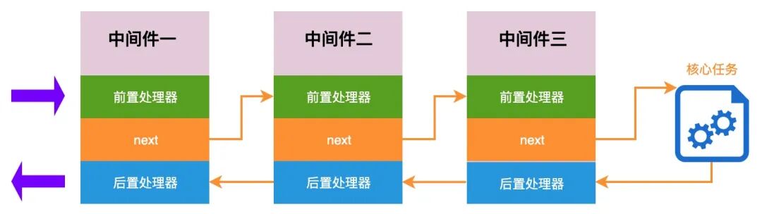 function compose(middleware) { // 省略部分代码 return function (context, next) { let index = -1; return dispatch(0); function dispatch(i) { if (i <= index) return Promise.reject(new Error("next() called multiple times")); index = i; let fn = middleware[i]; if (i === middleware.length) fn = next; if (!fn) return Promise.resolve(); try { return Promise.resolve(fn(context, dispatch.bind(null, i + 1))); } catch (err) { return Promise.reject(err); } } };}利用上述的 compose 函数,我们就可以实现以下通用的任务处理流程: