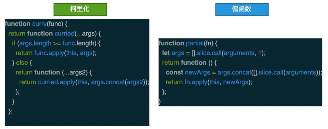 function partial(fn) { let args = [].slice.call(arguments, 1); return function () { const newArgs = args.concat([].slice.call(arguments)); return fn.apply(this, newArgs); };}4.3 偏函数实现 vs 柯里化实现