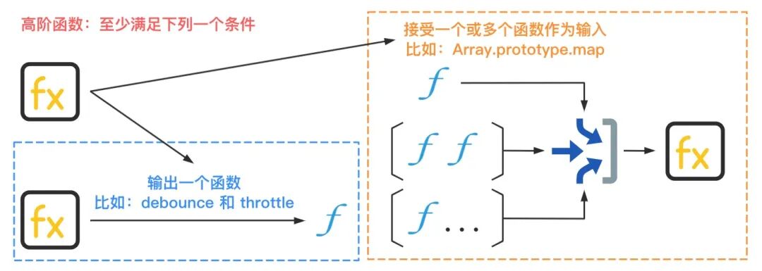 // Array.prototype.map 高阶函数const array = [1, 2, 3, 4];const map = array.map(x => x * 2); // [2, 4, 6, 8]// Array.prototype.filter 高阶函数const words = ['semlinker', 'kakuqo', 'lolo', 'abao'];const result = words.filter(word => word.length > 5); // ["semlinker", "kakuqo"]而输出一个函数,即调用高阶函数之后,会返回一个新的函数。我们日常工作中,常见的 debounce 和 throttle 函数就满足这个条件,因此它们也可以被称为高阶函数。