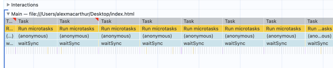 }用 postTask() 运行我们的循环有趣的地方在于计划任务之间的时间间隔。这是 400 毫秒火焰图的又一个片段。请注意,每个新任务在前一个任务之后执行得多么紧密。