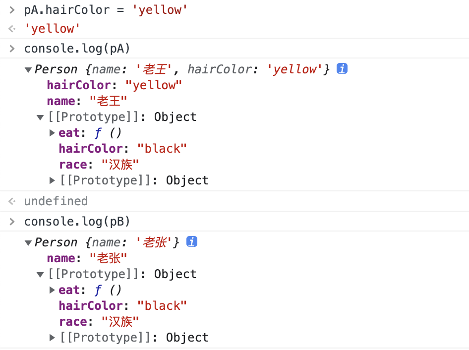 此时我们打印 pA、pB,我们惊喜的发现,他们有了属性 hairColor 和 eat 方法;实例动态的获得了 Person 构造函数之后添加的属性、方法,这就是原型意义所在!可以动态获取,这样可以节省内存。