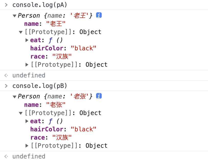 alert(pB.race); // 汉族现在,race 属性放在 prototype 对象里,是两个实例对象共享的。只要修改了 prototype 对象,就会同时影响到两个实例对象。