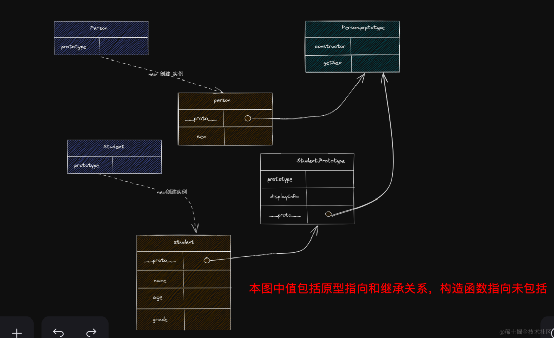 前面这段逻辑有点绕,看一张图就理解了,- 总结来说:直接实例与其构造函数原型的关系:每个Person实例的__proto__指向Person.prototype,每个Student实例的__proto__指向Student.prototype。