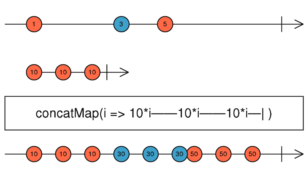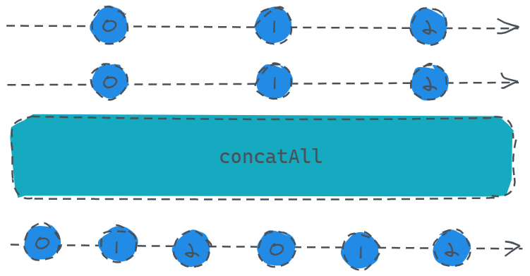 顾名思义,该操作符有点像我们js中数组方法concat,用于将多个Observable合成一个,不过它有个注意点在于它是串行的,也就是合并了两个Observable,那订阅者在获取值的时候会先获取完第一个Observable,之后才开始接收到后一个Observable的值。