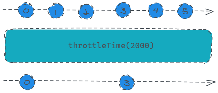 该操作符主要能力跟我们认知的节流函数也是一致的,就是它会控制一定时间内只会发送一个数据,多余的会直接抛弃掉。唯一和防抖操作符不一致的地方就在于它对于第一个值是不会阻塞的。