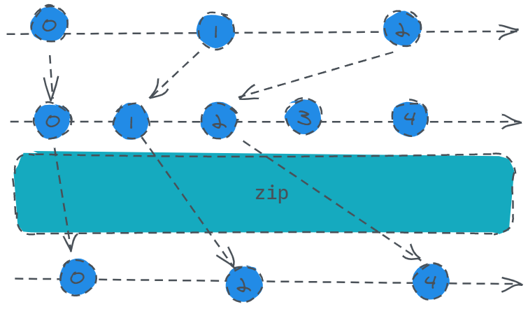 等到两个源中的任意一个源结束了之后,整体就会发出结束信号,因为后续不存在可以对齐的数了。