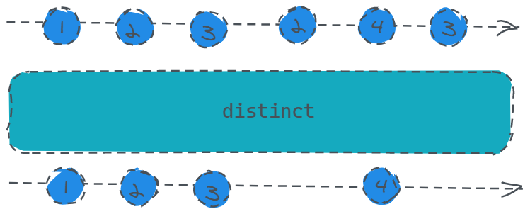 这个操作符也十分好理解,一句话可以概括,使用了该操作符,那么订阅者收到的数据就不会有重复的了,也就是它是用来过滤重复数据的。