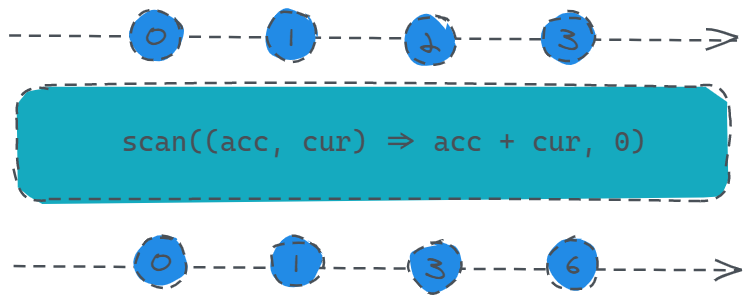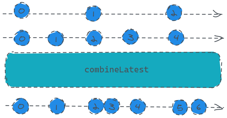 s2发送一个 0,而此时s1未发送值,则我们传入的回调不会执行,订阅者也不会接收到值。s1发送一个 0,而s2最后一次发送的值为 0,故调用回调函数,并把这两个参数传入,最终订阅者收到s2发送一个 1,而s1最后一次发送的为 0,故结果为 1。s1发送一个 1,而s2最后一次发送的值为 1,故结果为 2。s2发送一个值为 2,而s1最后一次发送的值为 1,故结果为 3。s2发送一个值为 3,而s1最后一次发送的值为 1,故结果为 4。... 重复上述步骤。