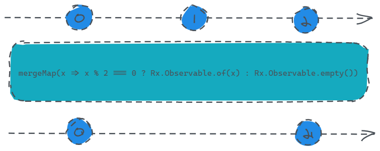 const source = Rx.Observable.from([1, 2, 3, 2, 4, 3]);const result = source.filter(x => x !== 3);result.subscribe(x => console.log(x));程序运行结果就是除了 3 以外的其他值都被打印出来。