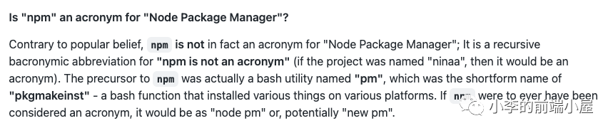 很多人认为 npm 是 node package manager 的缩写,其实不是,而且 npm 根本也不是任何短语的缩写。