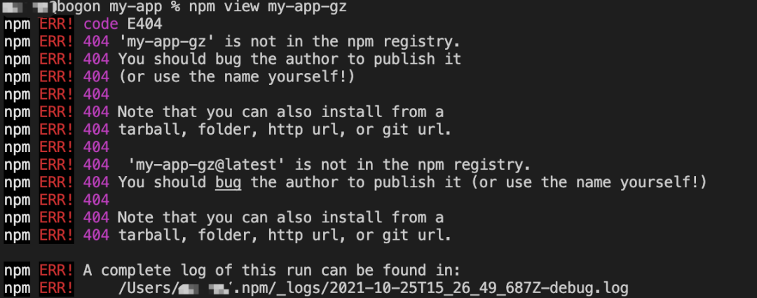名称不能和其他模块的名称重复,可以使用 npm view 命令查询模块明是否重复,如果不重复就会提示 404: