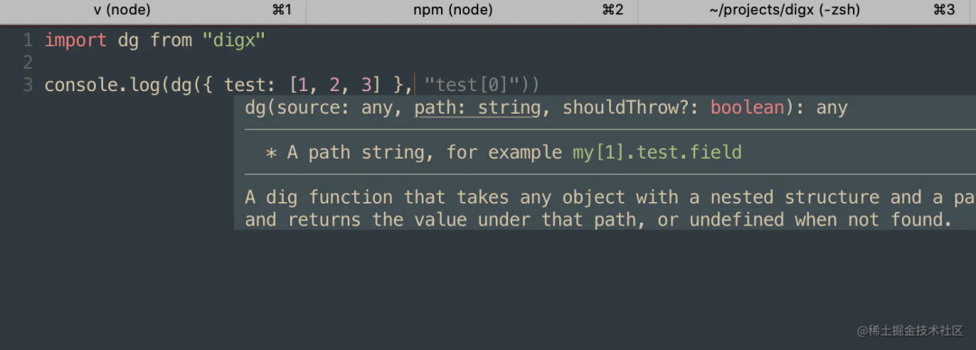 import dg from "digx"console.log(dg({ test: [1, 2, 3] }, "test[0]"))结果非常棒!