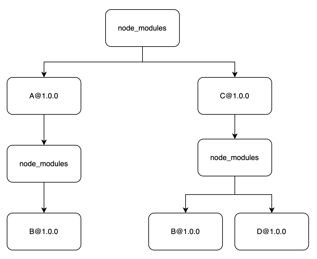 比如项目依赖了 A 和 C,而 A 和 C 依赖了相同版本的 B@1.0,而且 C 还依赖了 D@1.0.0,node_modules 结构如下: