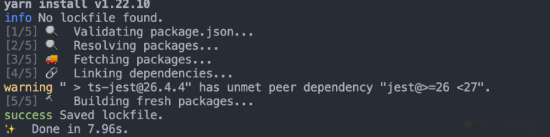 首先解析peerDependencies信息,之后基于扁平化原则(yarn 扁平化规则不同于 npm,使用频率较大的版本会安装到顶层目录,这个过程称为 dedupe),从缓存复制依赖至当前项目node_modules目录。构建包(building fresh package):依赖包存在二进制文件进行构建。